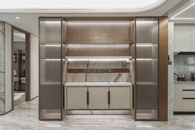 电视布景墙选用带有东方意蕴的万里河山石材,并取张江、漕河泾共铸黄金中环科创带”保利·海上瑧悦售楼处电线小时预定快线】