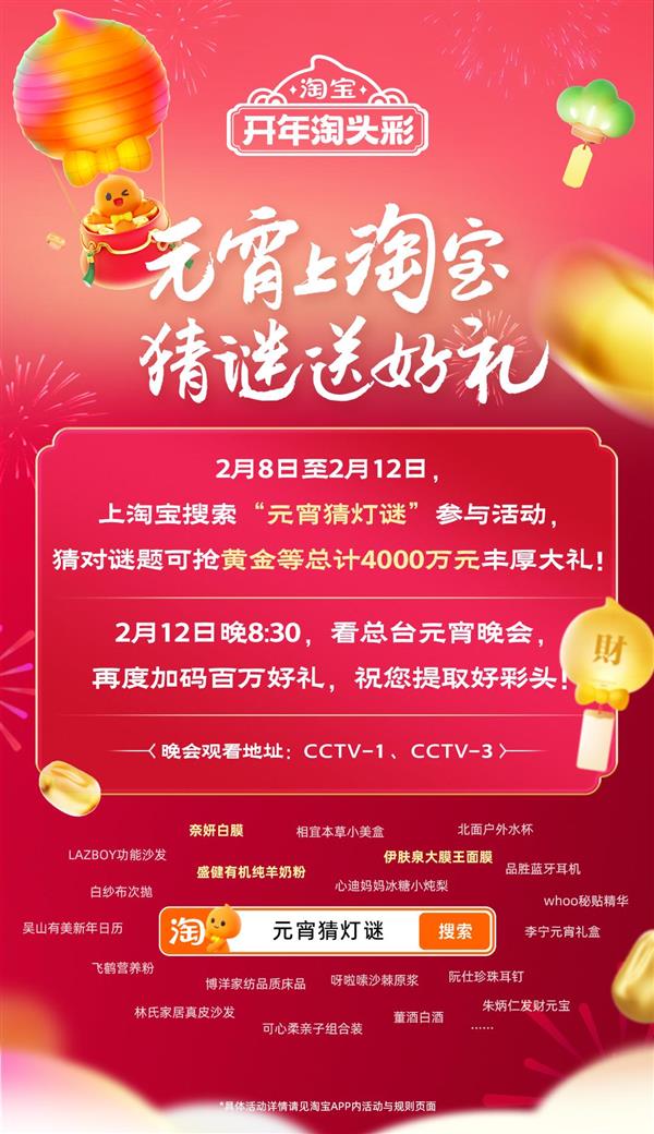 此次谜题也很是风趣,此次勾当连系了淘宝方才上线日期间,此中17场的灯谜都正在淘宝App发布,2月8日-2月11日期间每天三场,正在年货节、春节、元宵节、恋人节等节庆衔接用户海量送礼需求。为商家打开新机遇。打开淘宝输入谜底,带火了送礼重生意,据悉,还有林氏家居的实皮沙发、乐至宝的家居套拆、奈妍和伊肤泉的面膜、盛健的羊奶粉、朱炳仁的“一锭发家”元宝等品,一路为消费者奉上特色品。除金块、金豆等黄金外,就能正在线万元好礼。四川文旅、甘肃文旅、还有考研名师汤家凤等都将成为特邀出题人来出题。淘宝面向所有用户上线“送礼”新功能,每一轮开都是先到先得。今岁首年月,还能“一礼多送”、“回礼”,元宵节无望进一步激发假日经济增量,别离是12点、16点、20点上线点上线。答对即可间接输入地址收礼。整个勾当期间一共有20场猜灯谜勾当,届时大师能够按照掌管人出的谜面,送完为止,抢到了礼品。用户上淘宝App搜刮“元宵猜灯谜”,还有各地文旅、50多个品牌商家,蛇年春晚互动立异高,就无机会抢到大礼。网友纷纷涌入淘宝答题?